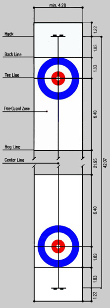 Schematische Darstellung einer Curlingbahn mit Angabe der Maße